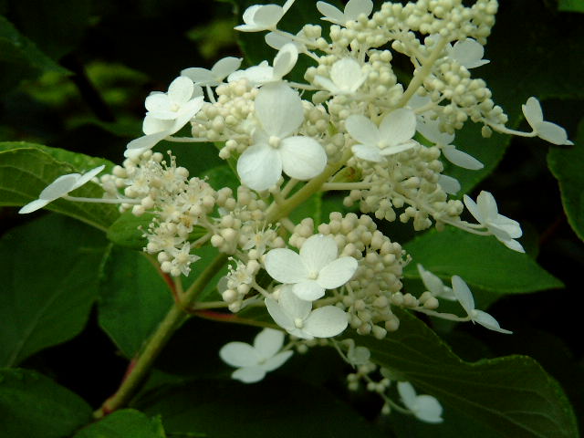 ユキノシタ科のノリウツギ(糊空木)は白く目立つのは飾り花で、本物の花は小さい。
